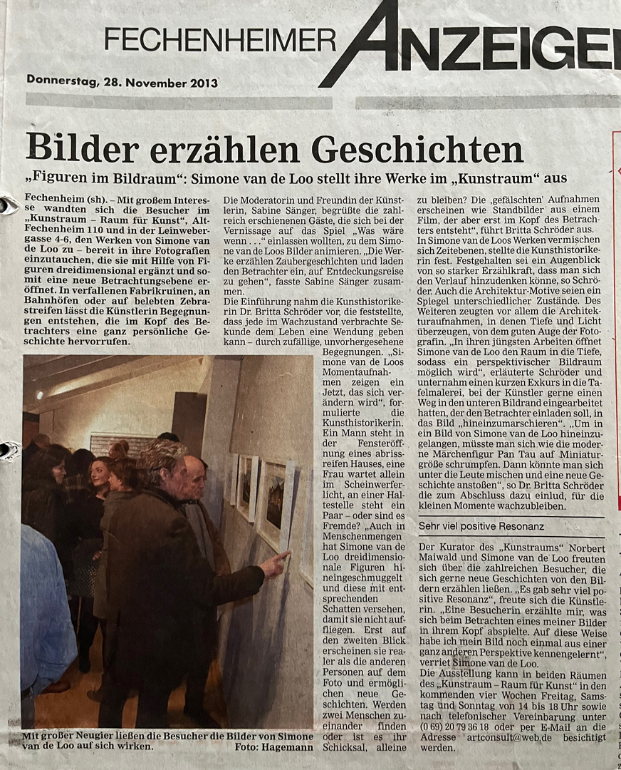 Das Potenzial der Wirklichkeit und die in der fotografischen Momentaufnahme nicht verwirklichten Optionen finden in den Werken von Simone van de Loo einen Ort. Nie sind die Figuren so ins Bild gesetzt, dass ihre Geschichte einen eindeutigen Verlauf nähme. Das Ende bleibt offen. Unsere Fantasie entscheidet, wie es weiter- und wie es ausgehen könnte.